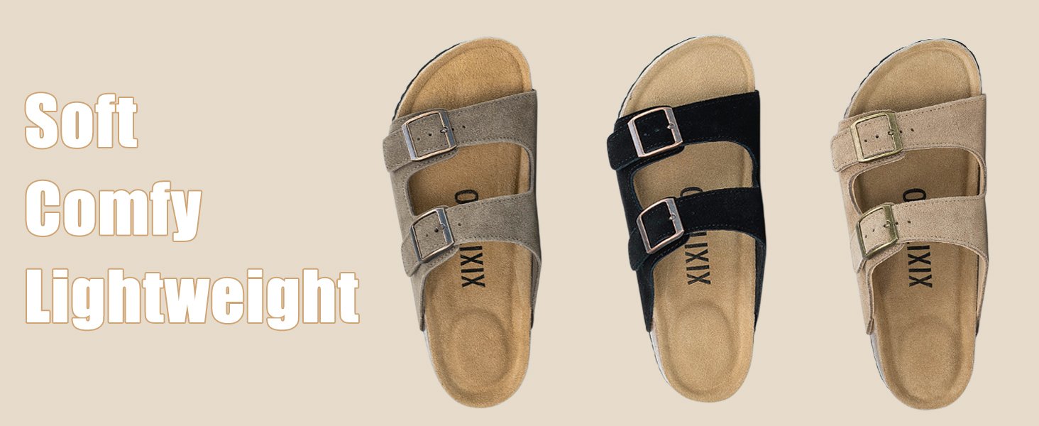 XIXITIAO Premium Suede Women Sandals, Dual Adjustable Buckle Flat Slides, Arch Support Non Slip Summer Daily Shoes