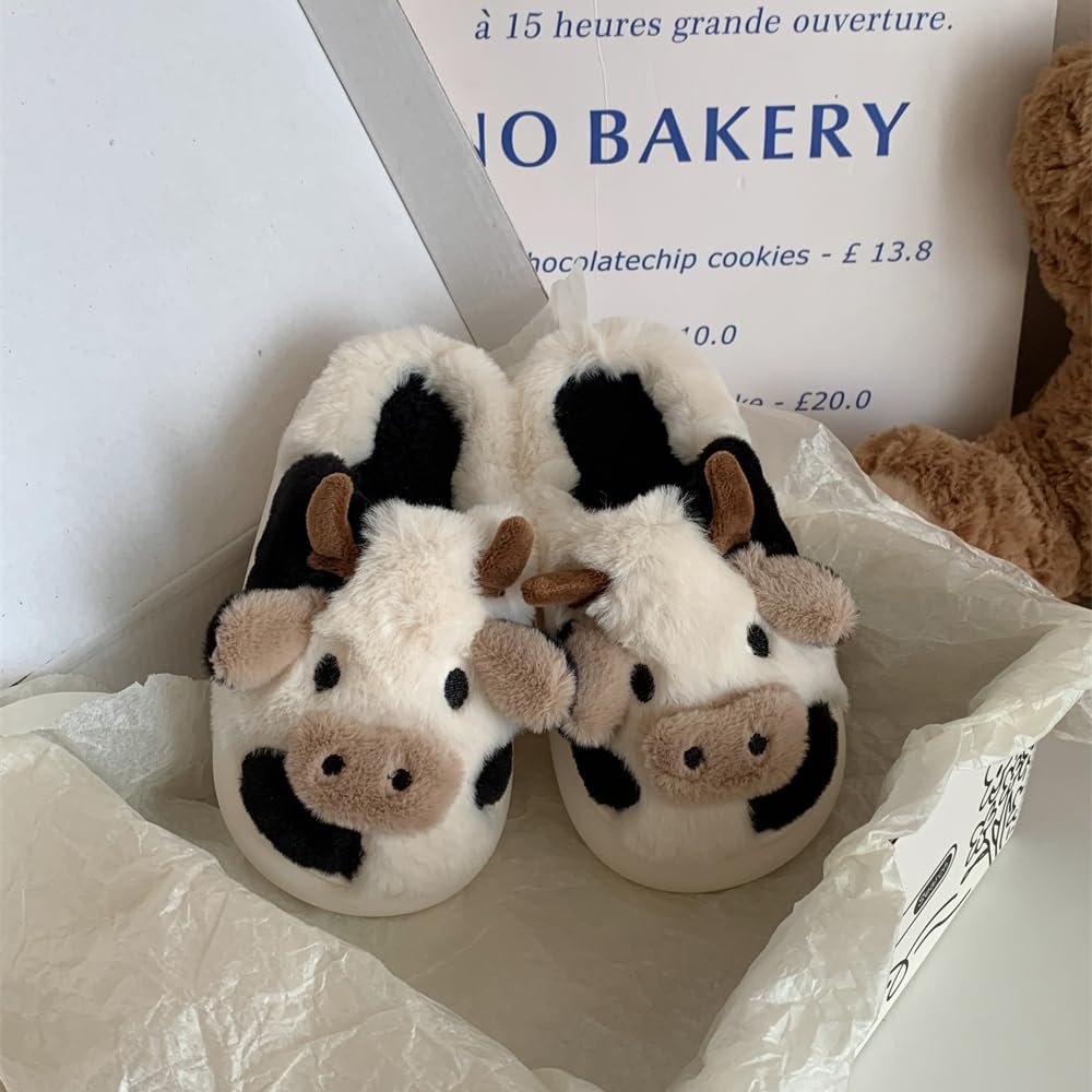 XIXITIAO Cartoon Cow Fuzzy Slippers for Kid Winter Indoor House Plush Slipper for Children Fluffy Shoes