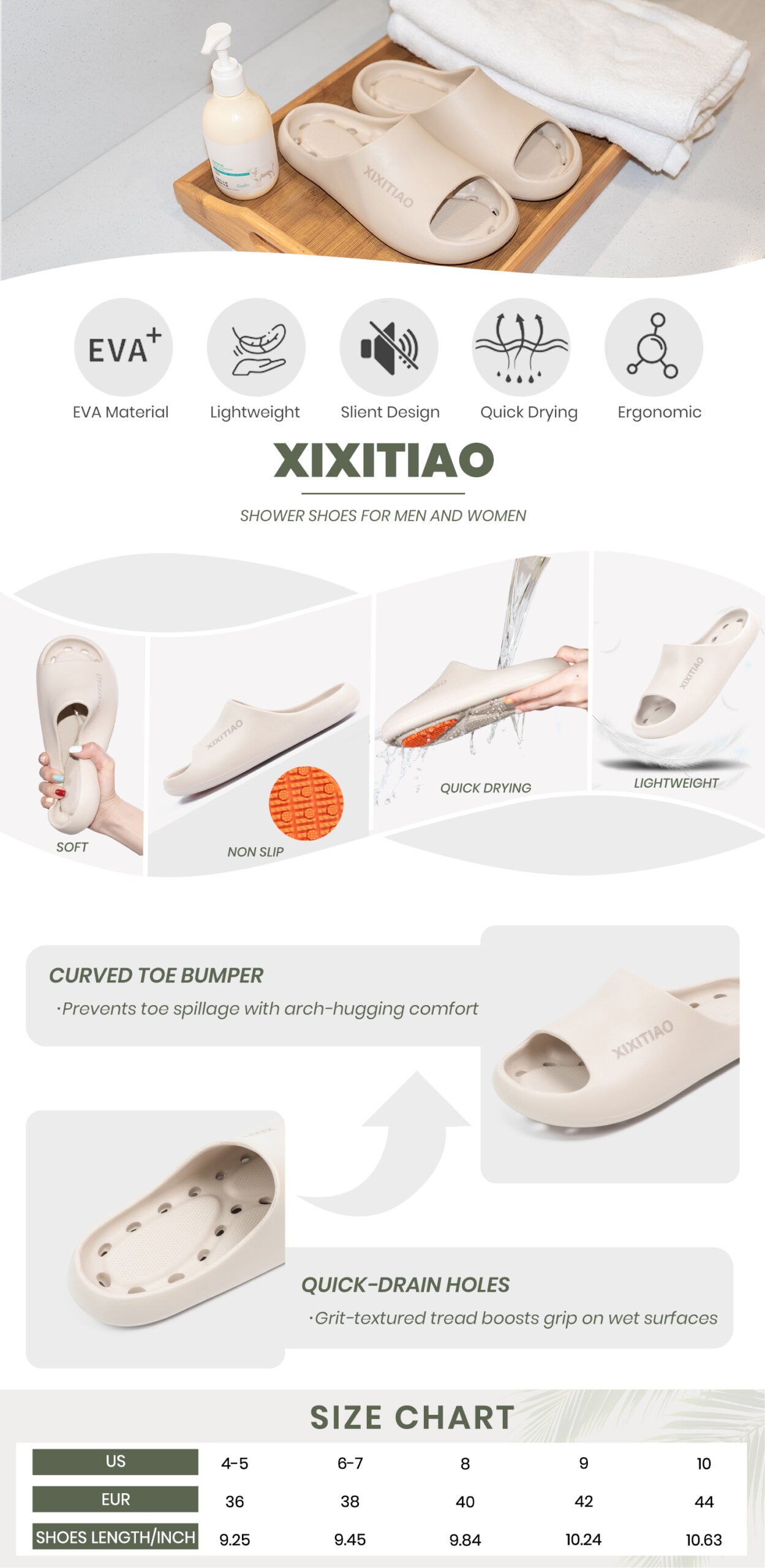 - Non-Slip Shower Shoes: Each pair of slipper has about 2,000 super-grip mirror contacts, more than 1,000 multi-directional hydrophobic grooves, and dozens of displayed asymmetric hydrophobic units for enhancing the anti-slip ability.