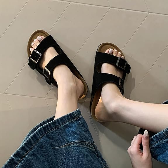 XIXITIAO Premium Suede Women Sandals, Dual Adjustable Buckle Flat Slides, Arch Support Non Slip Summer Daily Shoes