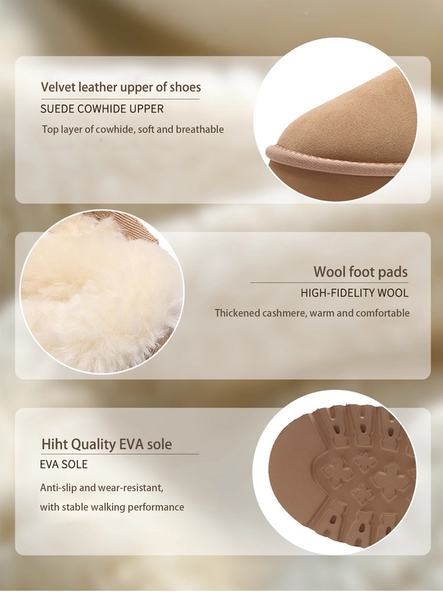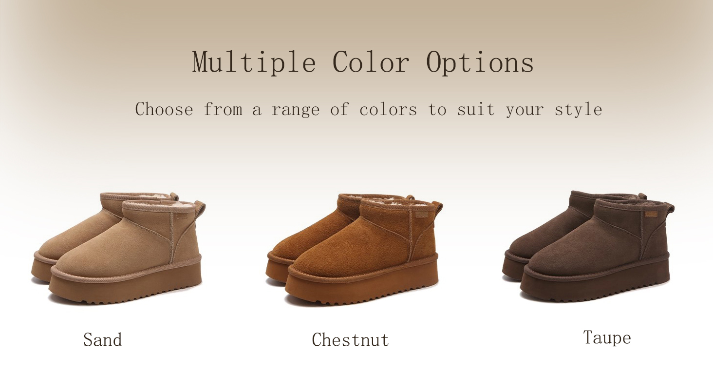 • Premium Suede Snow Boots: Crafted from high-quality suede leather, offering a delicate and skin-friendly touch that showcases luxury and durability.